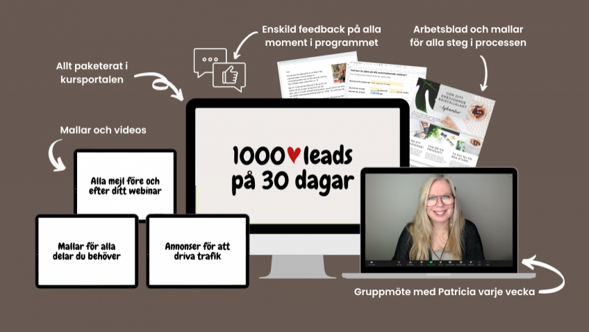 Mallar med tydliga exempel och enskild feedback på alla delar. Ditt kristallklara erbjudande, ditt webinar, dina e-postmeddelanden och dina Facebook-annonser.
